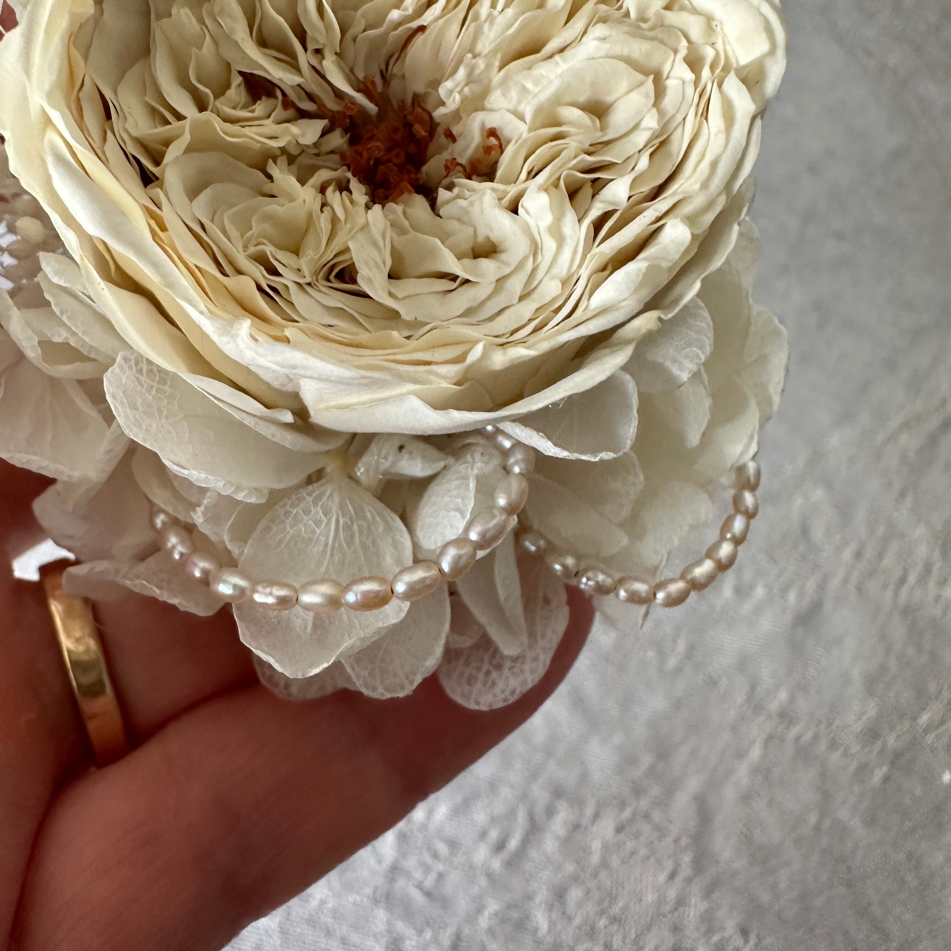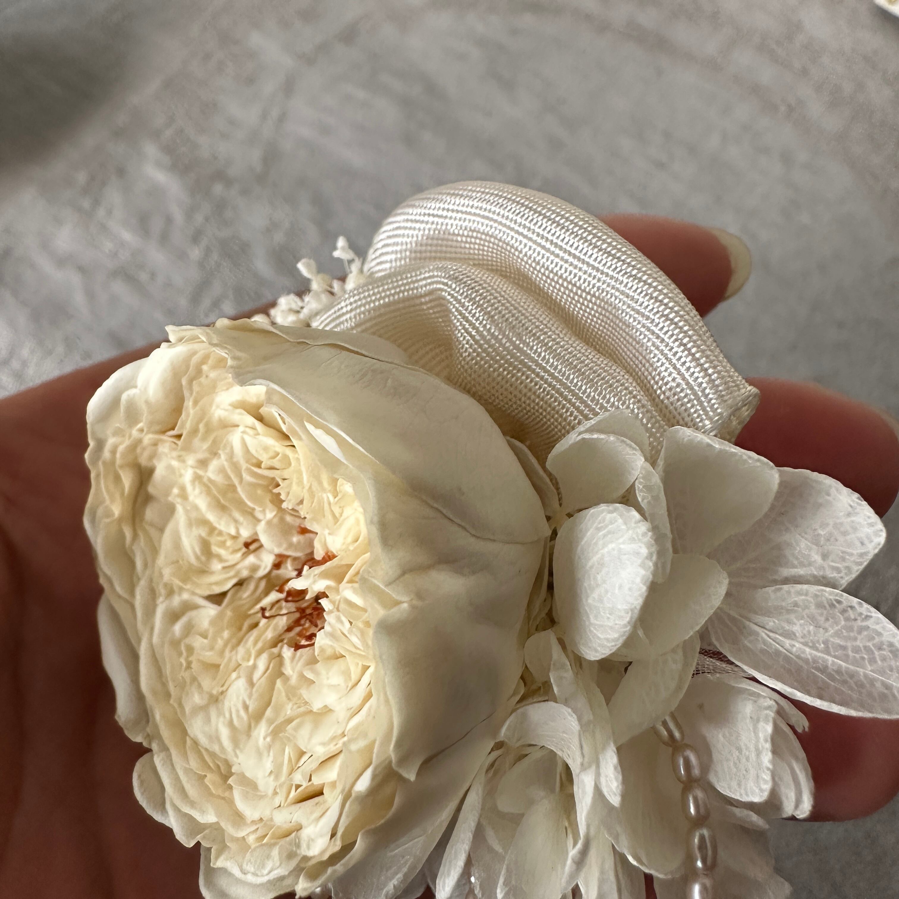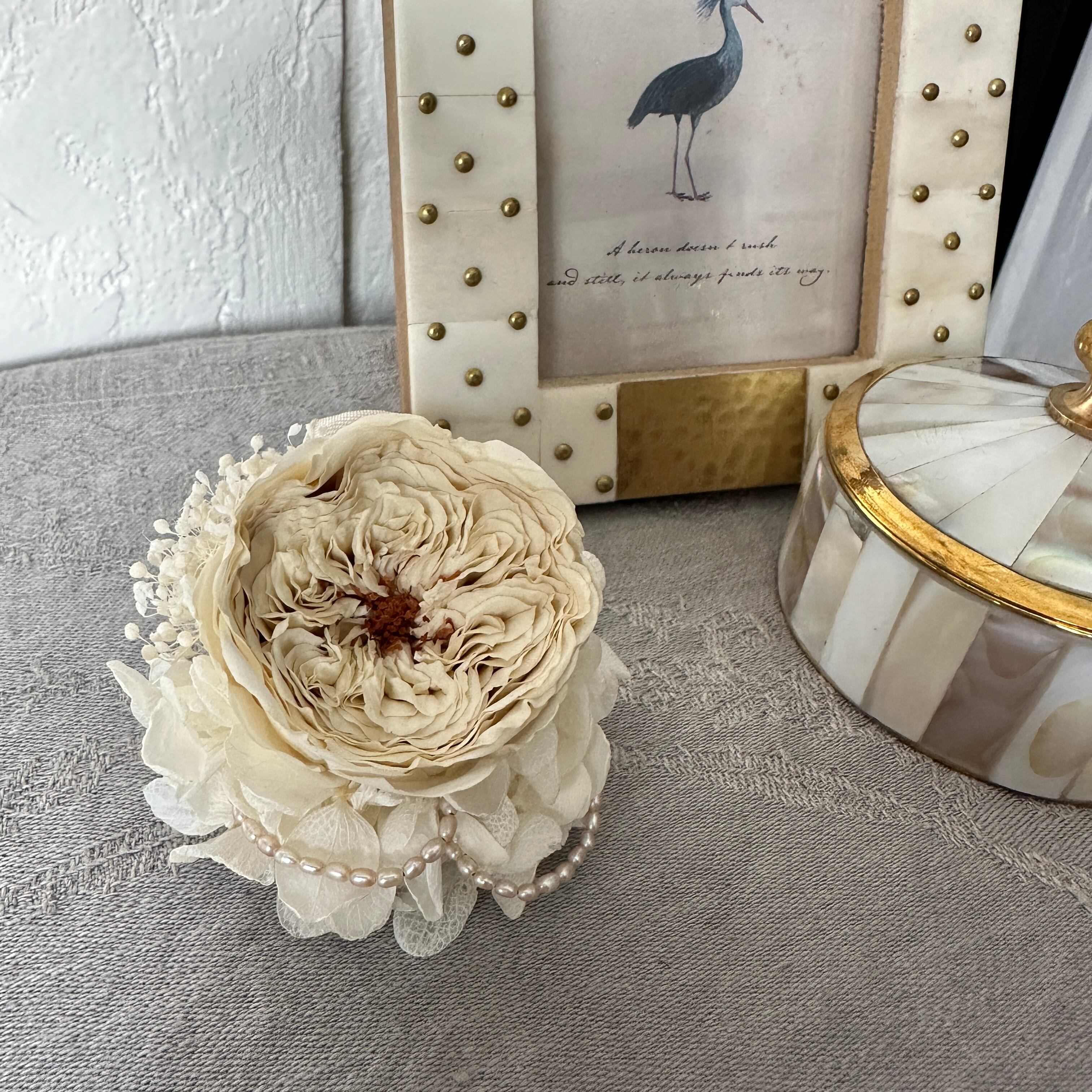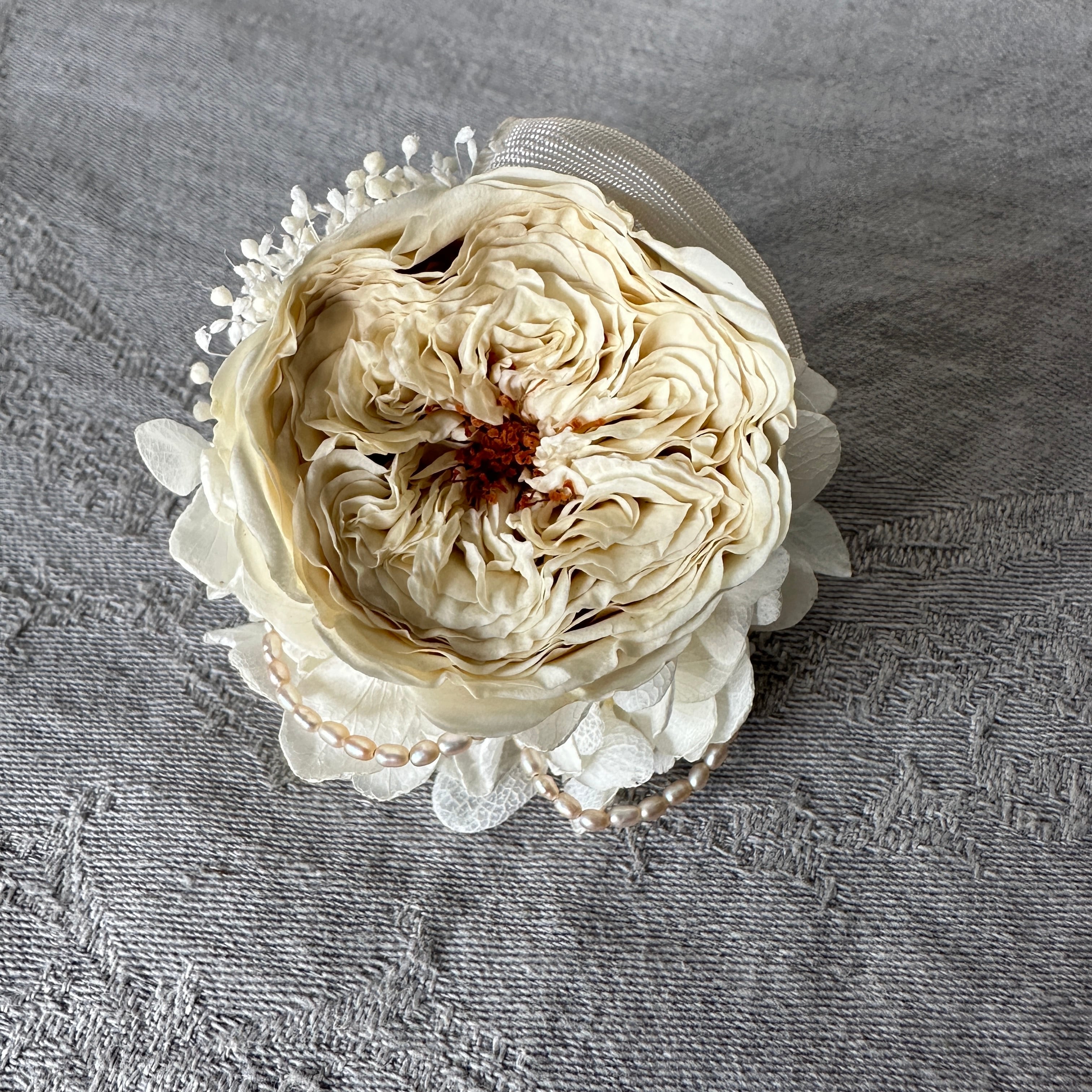 オールドローズの存在感を引き立てるようにアジサイとミニかすみ草を合わせ、アクセントに淡水パールを合わせた、プリザーブドフラワーのコサージュです。