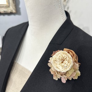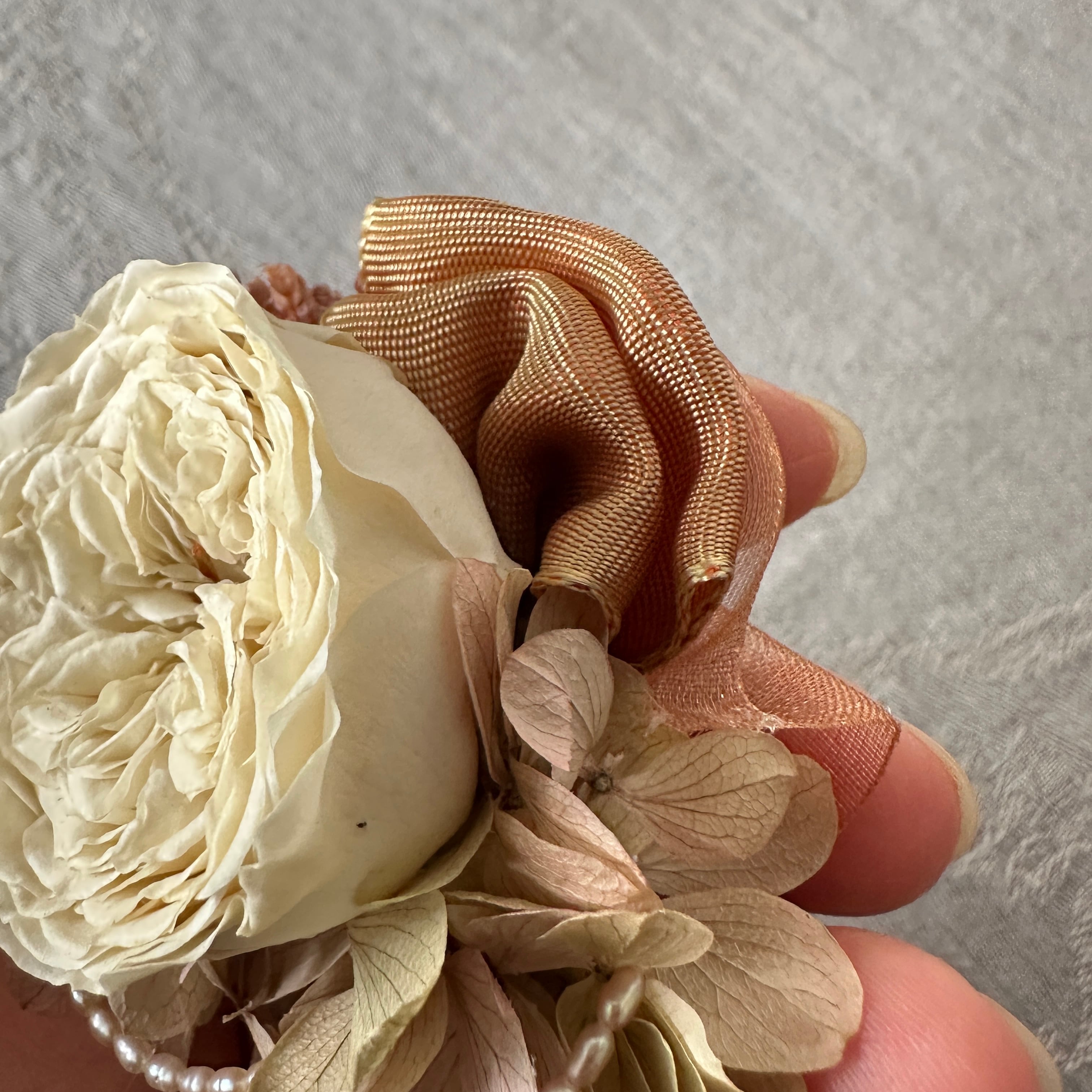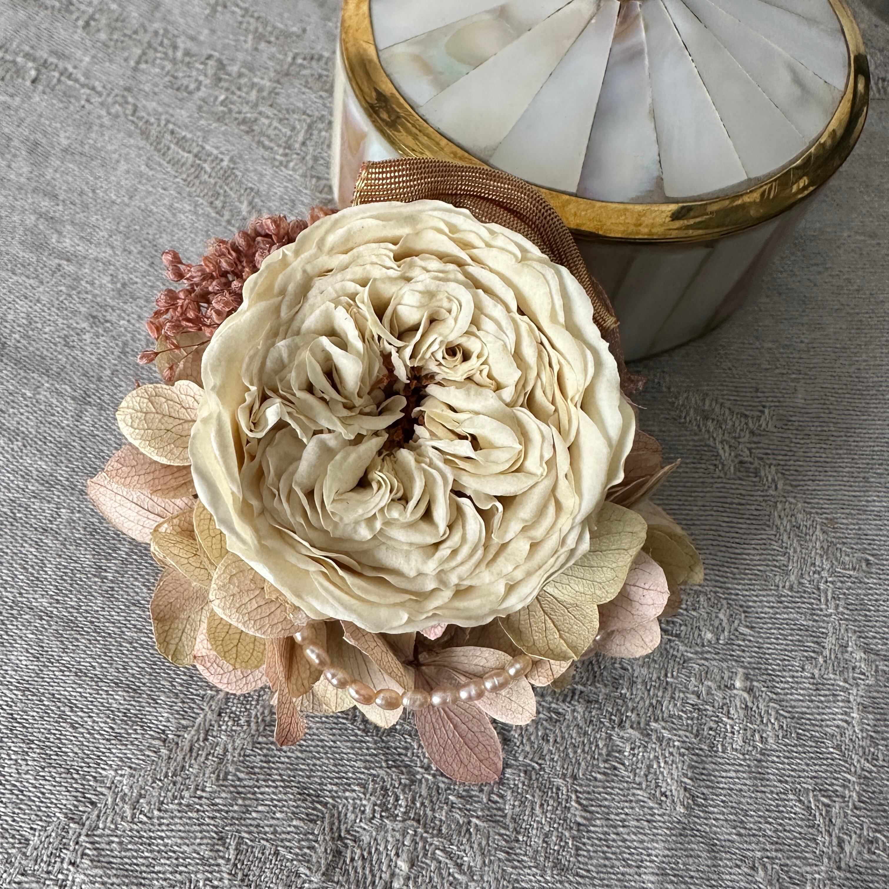 オールドローズの存在感を引き立てるようにアジサイとミニかすみ草を合わせ、アクセントに淡水パールを合わせた、プリザーブドフラワーのコサージュです。