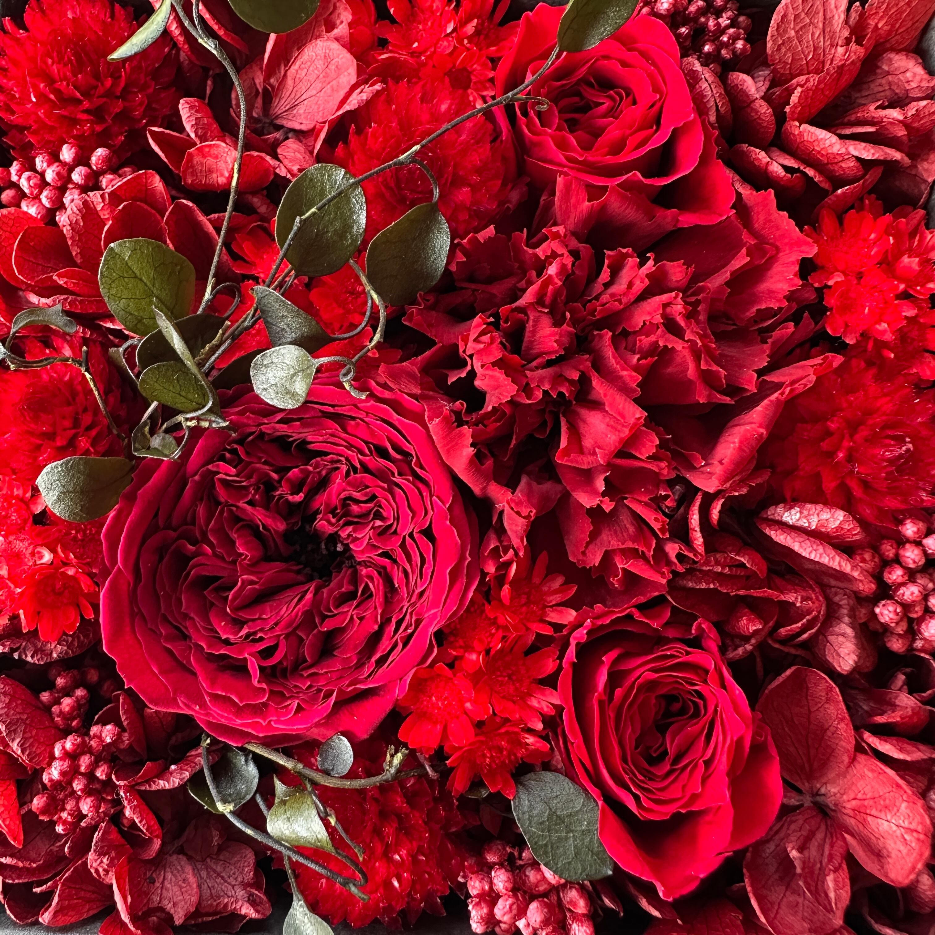 真紅や朱赤、ボルドー、ワインレッドなど様々な赤のグラデーションで敷き詰めたアレンジメントに、ワイヤープランツの葉がアクセントとして入っています。